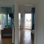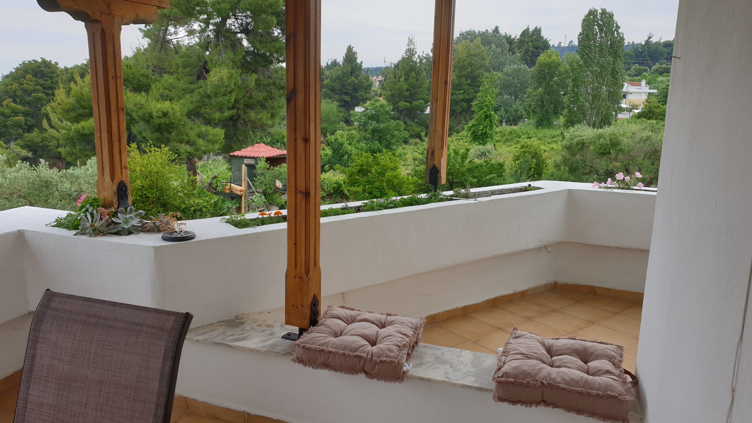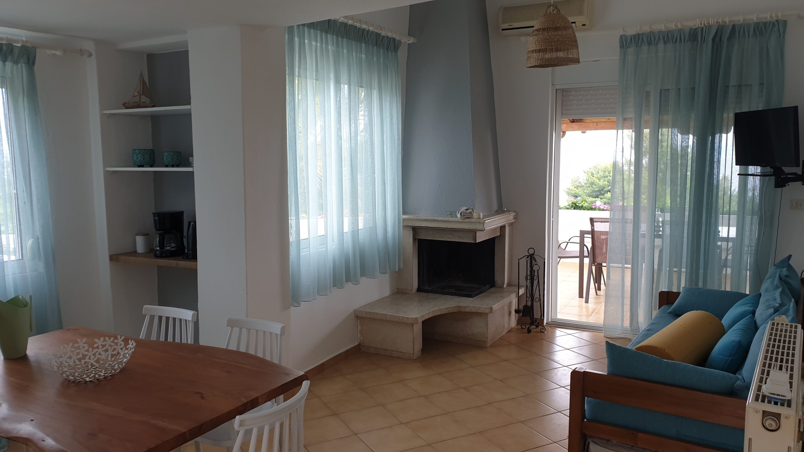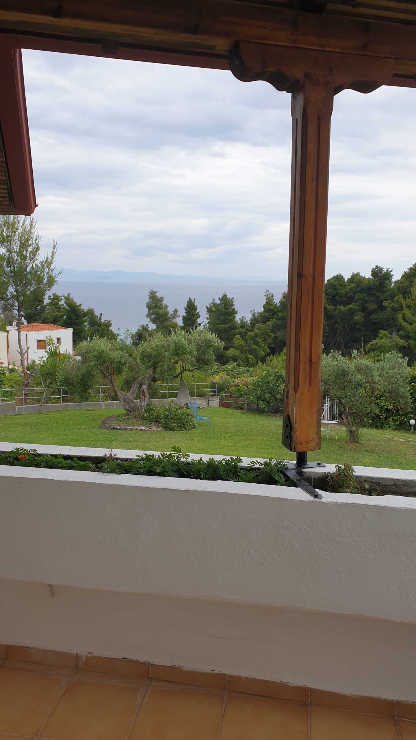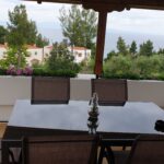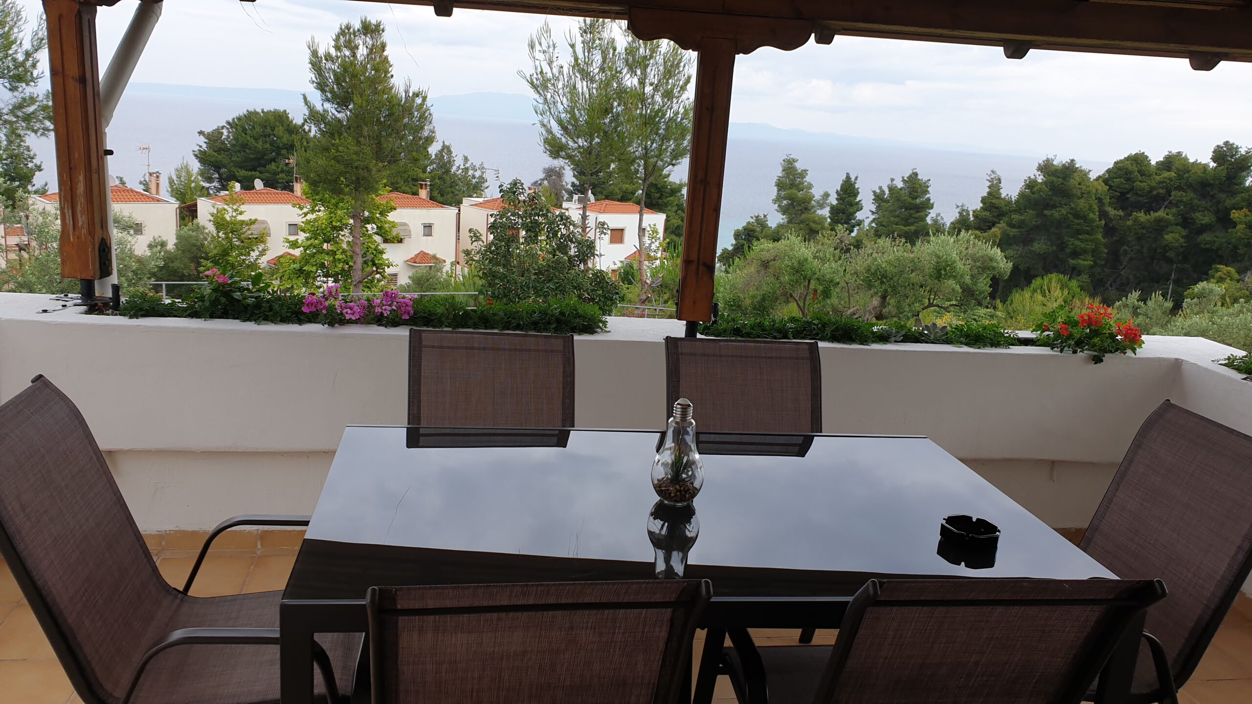 Outside, the apartment has a very large terrace with a dining table and unrestricted view of the sea, the peninsula and the bay of Sithonia and the garden.
