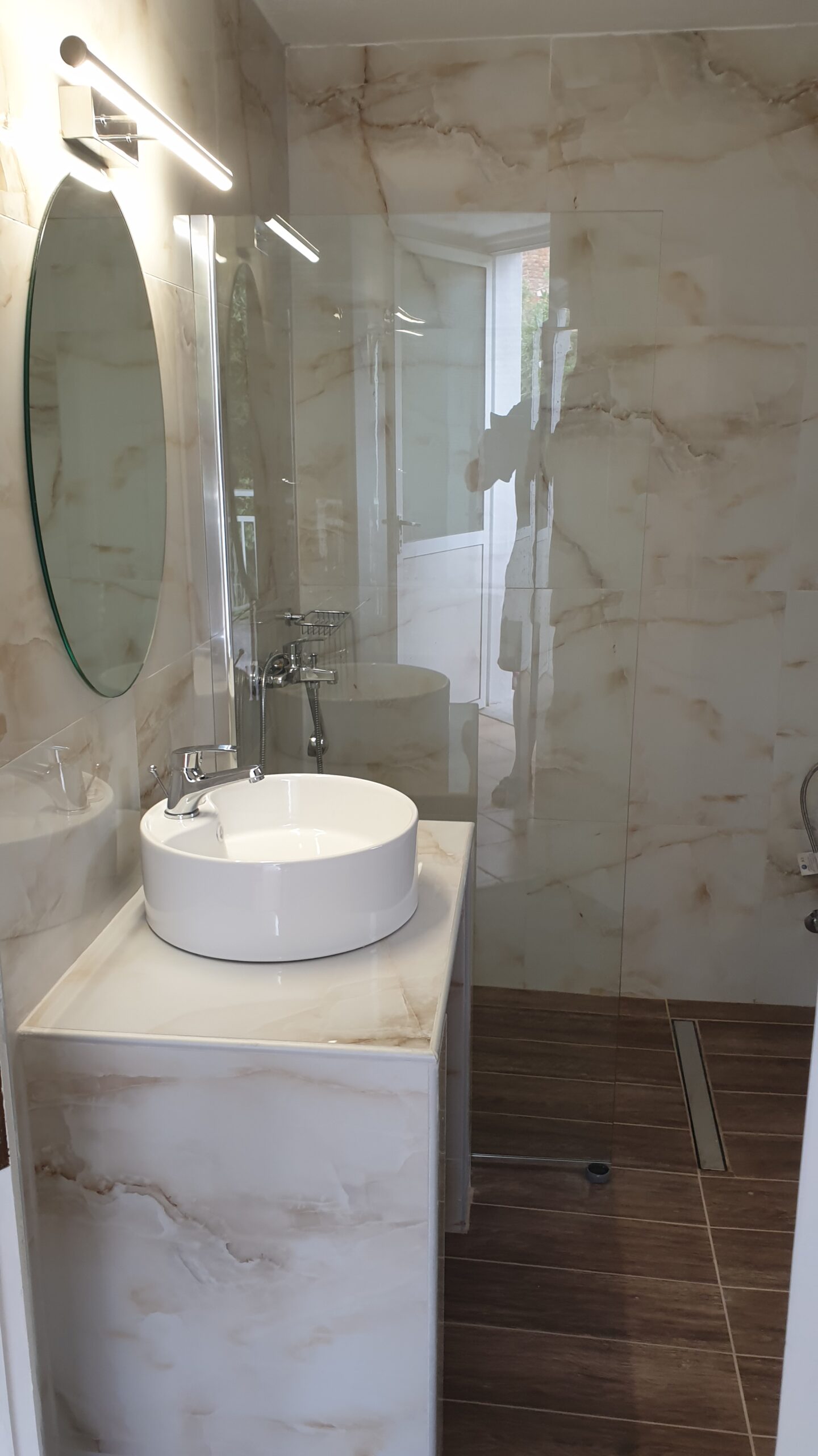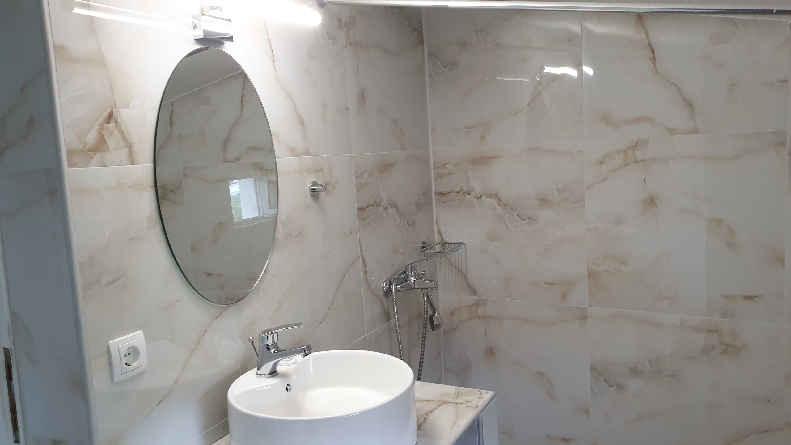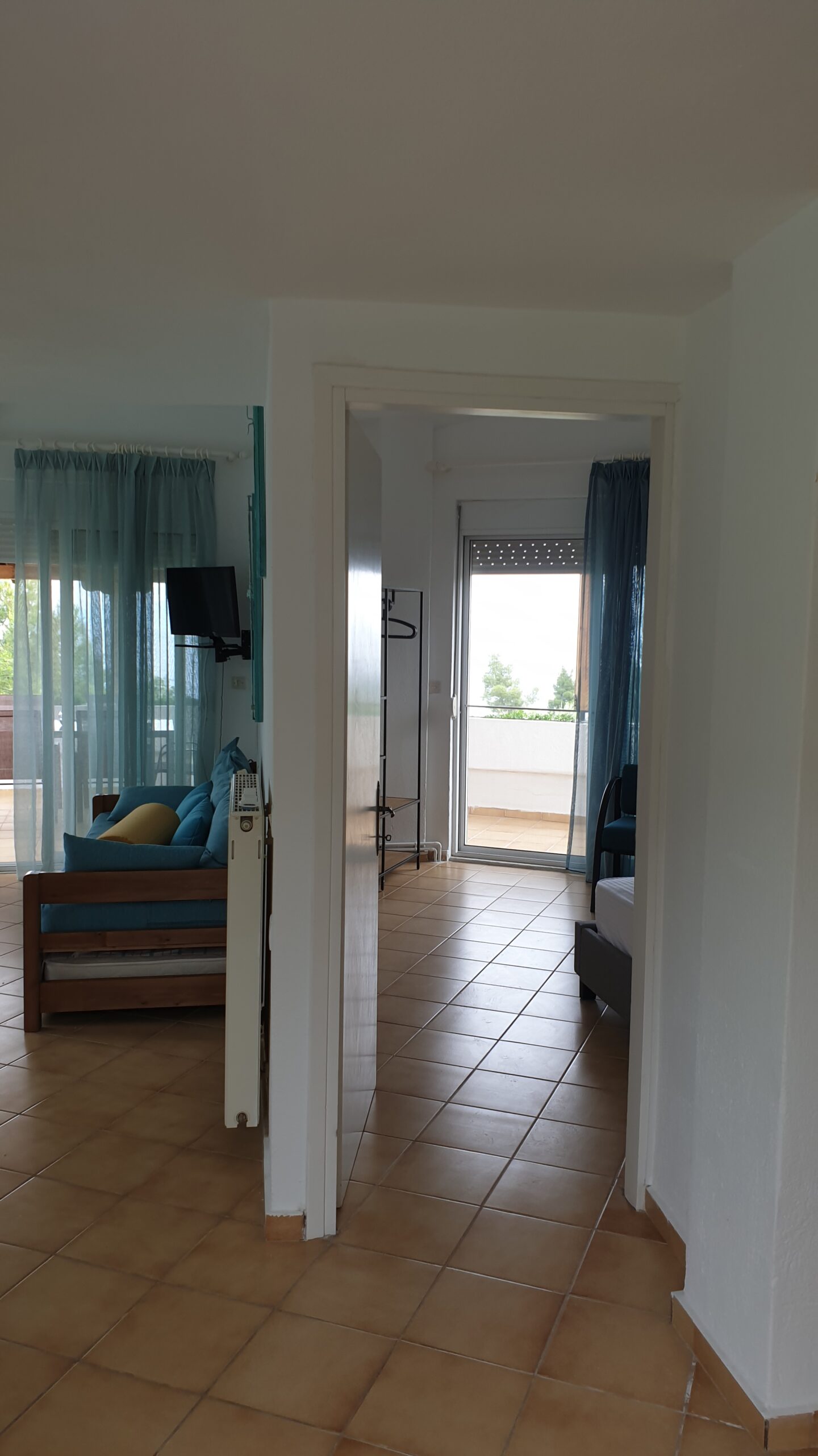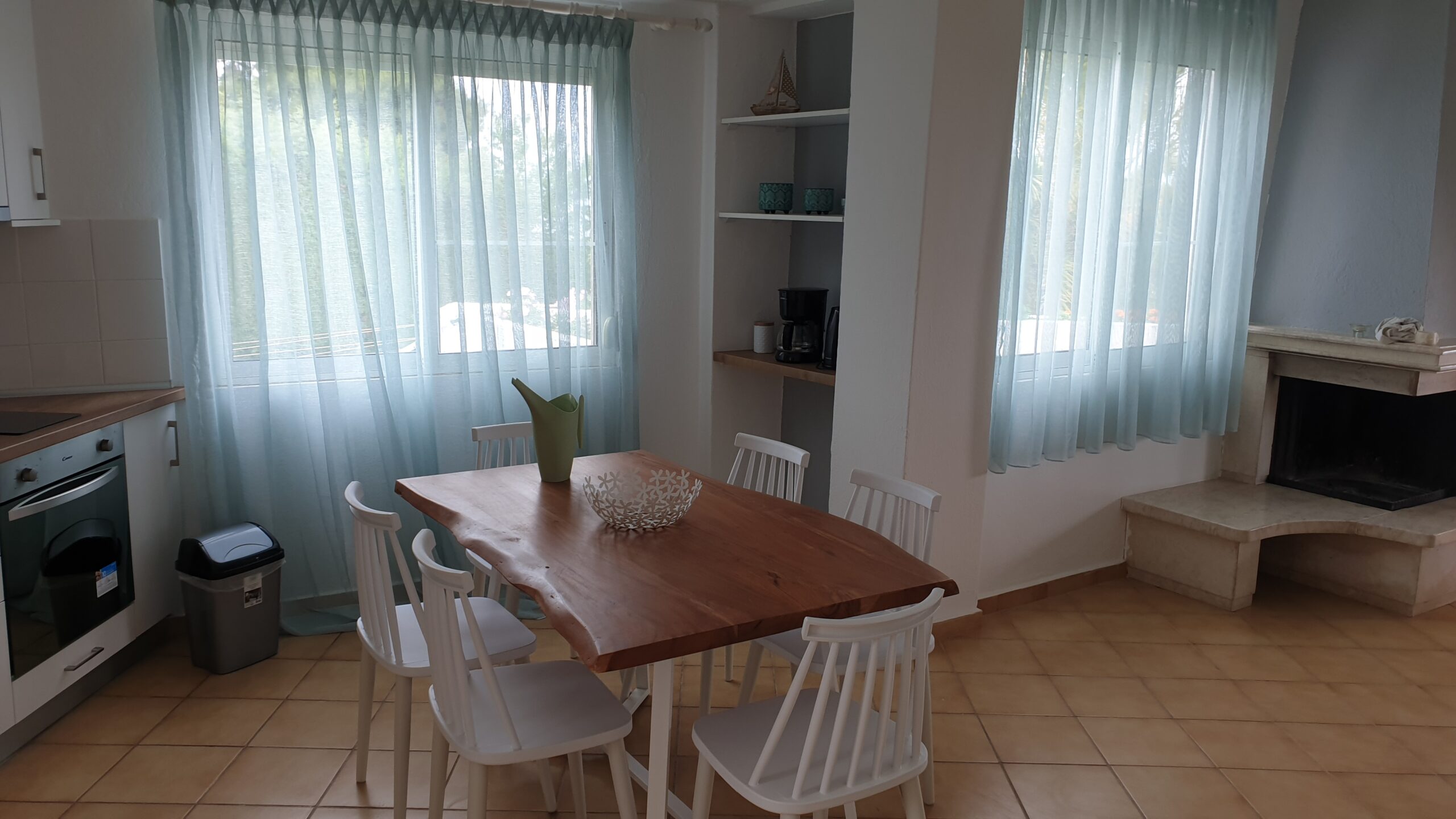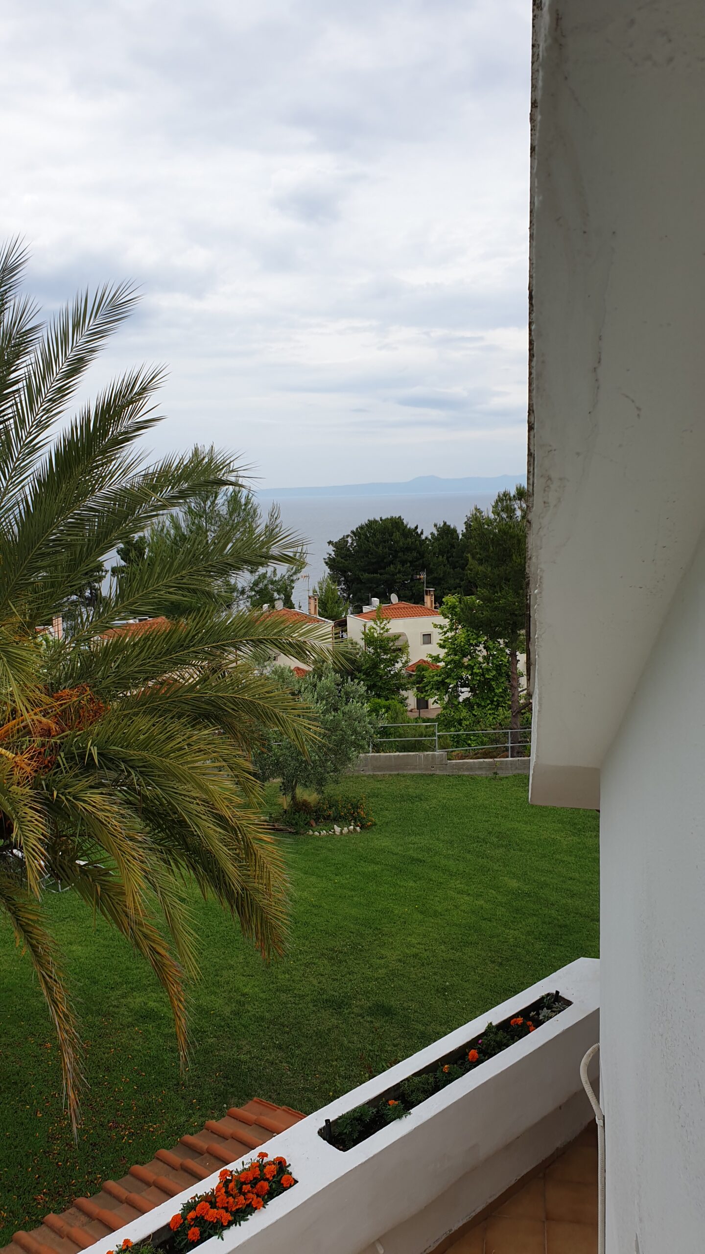 Outside, the apartment has a very large terrace with a dining table and unrestricted view of the sea, the peninsula and the bay of Sithonia and the garden.