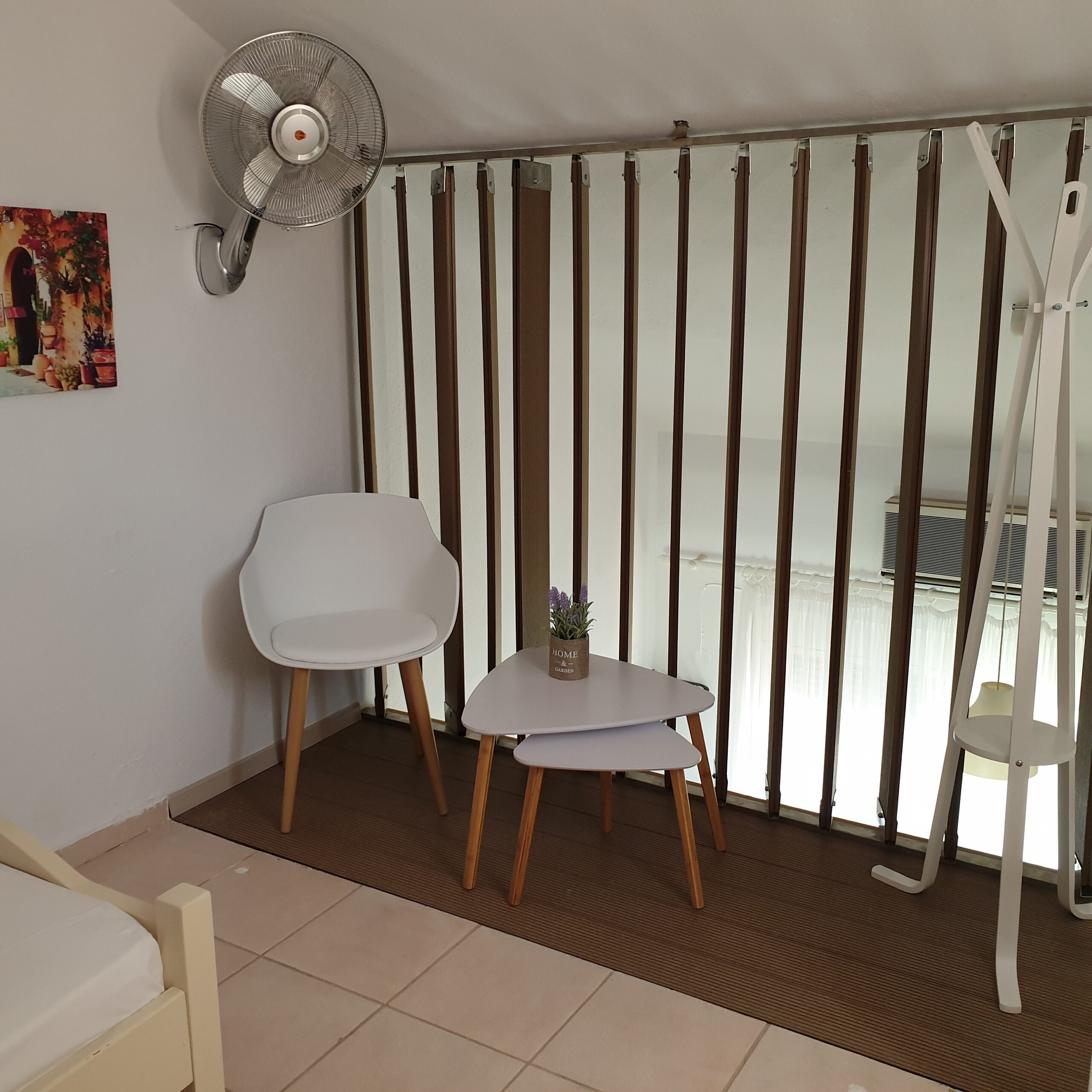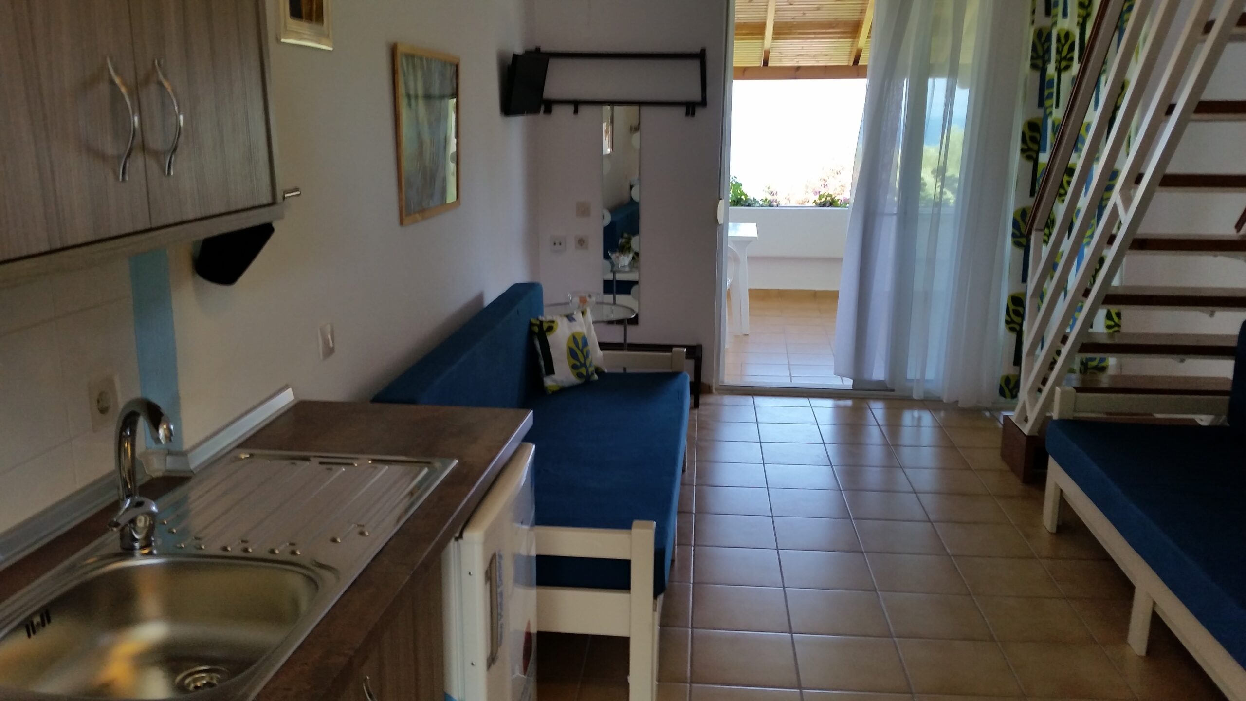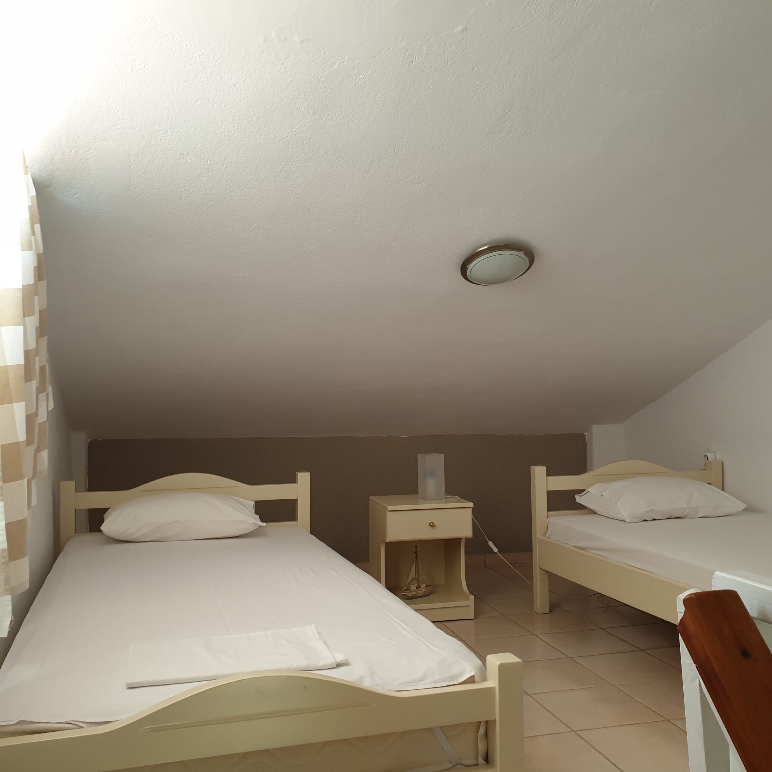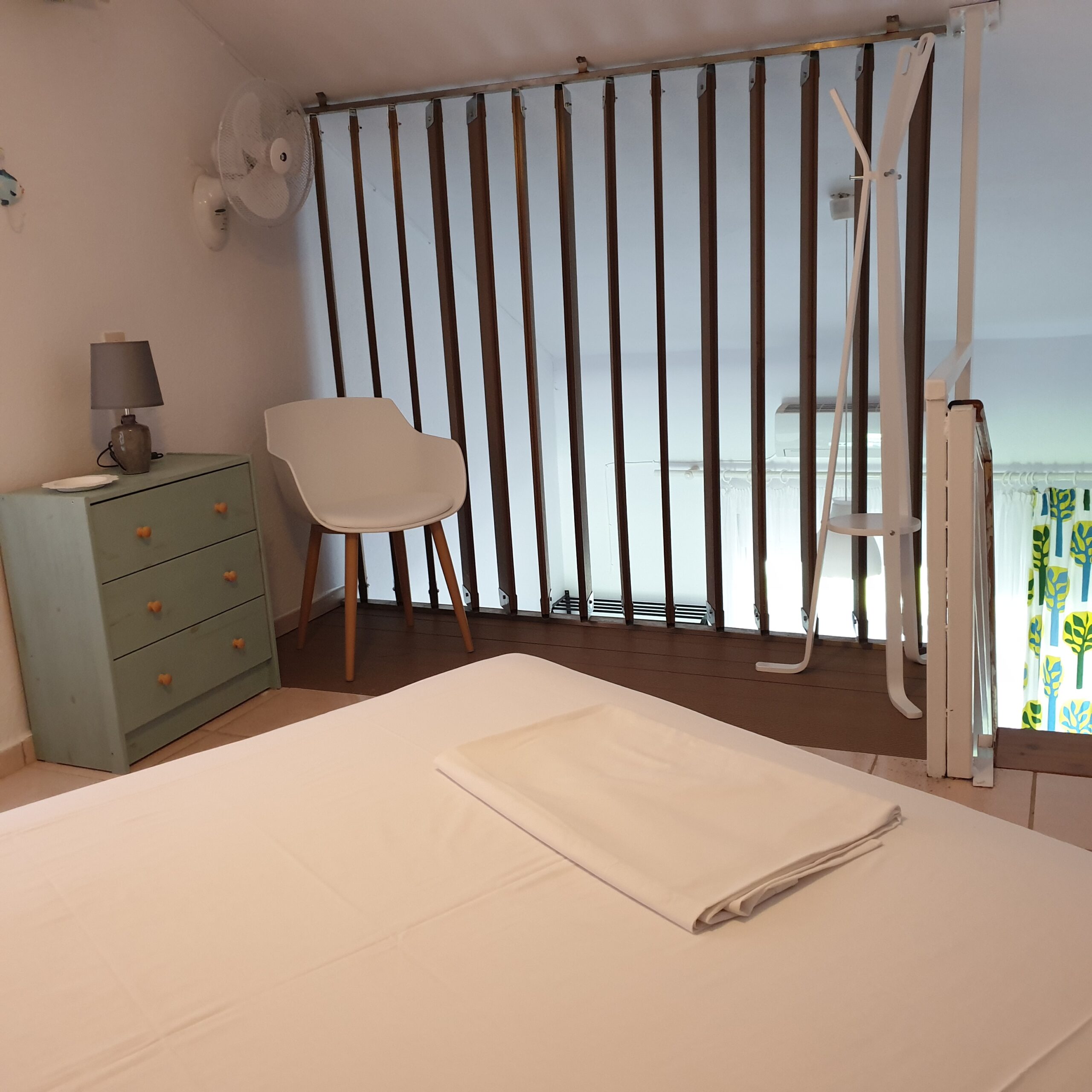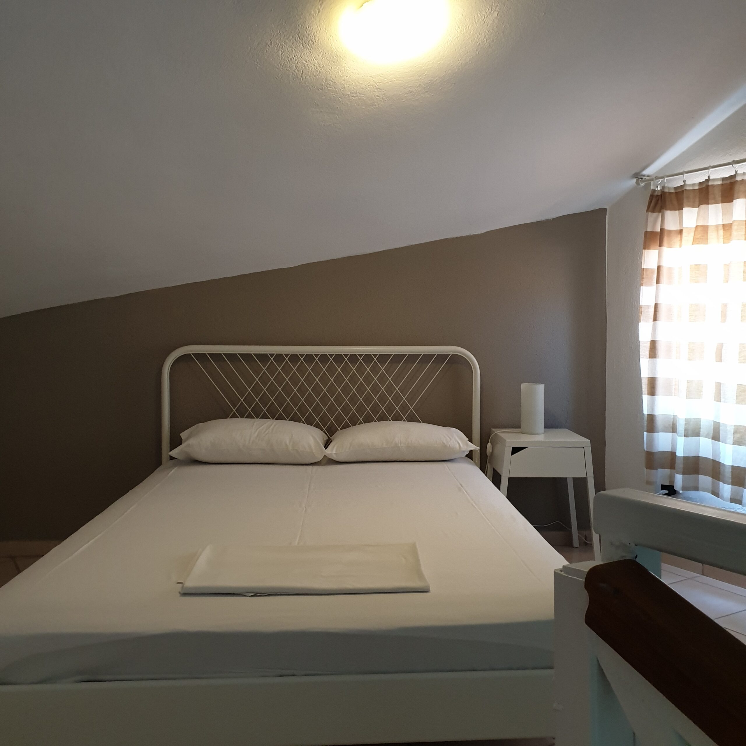 An apartment (~35 sqm), accommodating/sleeping up to 4 people, is ideal for families or a group of friends. It consists of two distinct areas: ground floor (kitchen/living room, toilet/bathroom) and attic (bedroom). The apartment is air-conditioned, furnished and fully equipped.