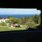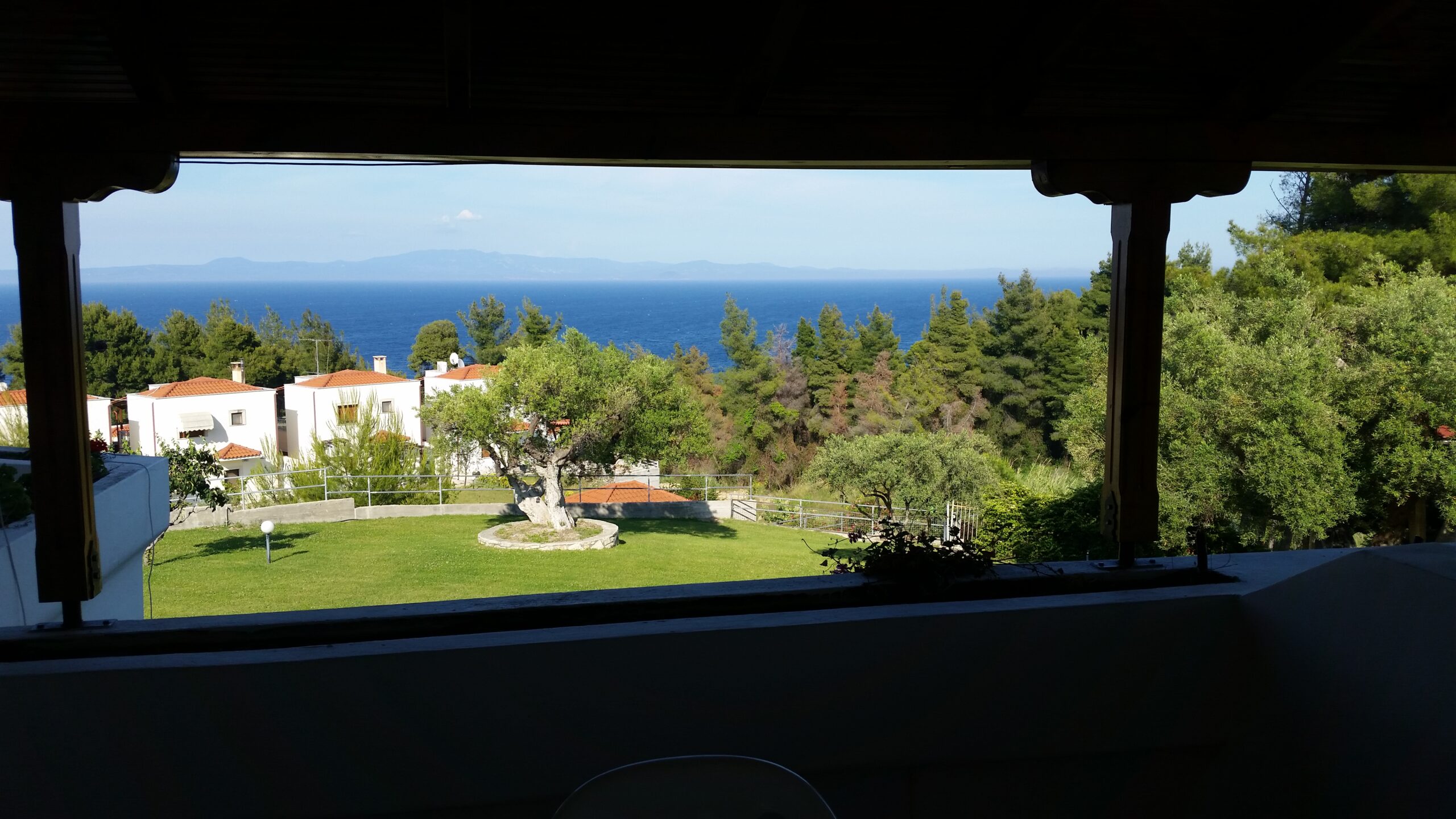 Outside, the apartment has a balcony with a table and a view of the sea, the peninsula and the bay of Sithonia and the garden.
